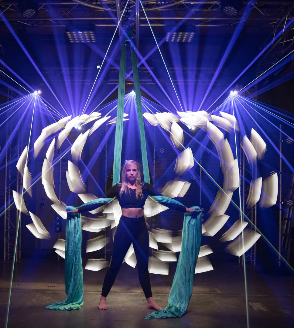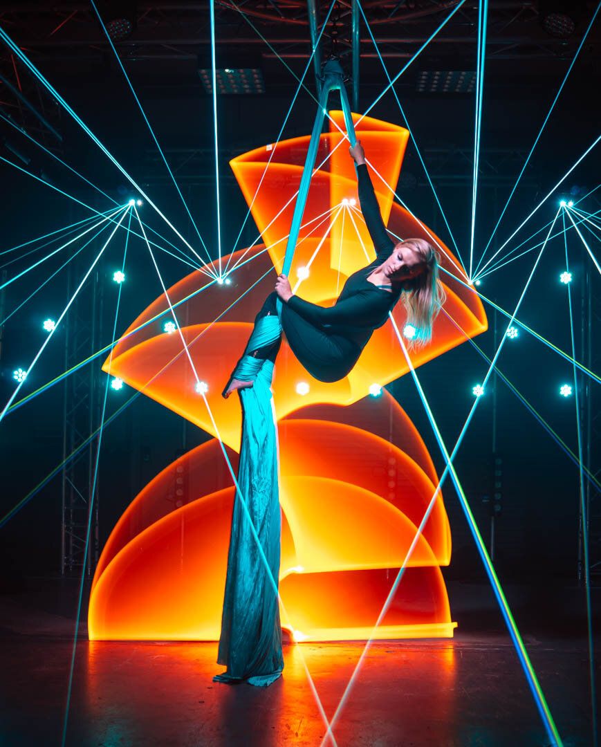 When light-painter Russel Klimas, a regular partner in the Eddy Sound Lighting Lab, mentioned to us that he knew and worked with an aerialist before, the gears immediately started turning. The idea of a graceful and beautiful aerialist under our Lighting Lab truss structure, surrounded by lights and lasers, was exactly what we were looking for. It’s creatives like Russell who help take our modest set-up to the next level. It’s the combination of grace, strength, persistence, and creativity that takes the output of the Lighting Lab to the next level. The synergy of creatives is what makes us great.